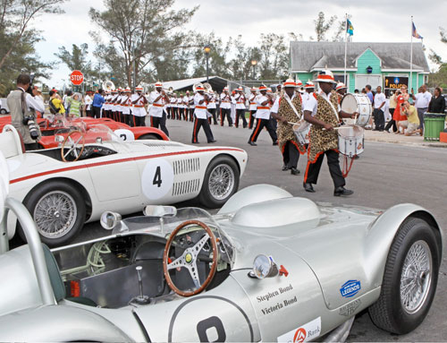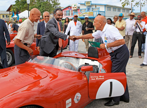 Sir Stirling Moss, Sir Arthur Foulkes and Lady Foulkes at Speed Week Opening CeremonyRBPF Band performs at Speed Week openingOfficial handshake with Minister Vanderpool-Wallace & Sir Stirling Moss. Governor General Sir Arthur Foulkes drops flag, signals official start.Thumbs up Minister of Tourism and Sir Stirling Moss wished good luck by Lady Moss.