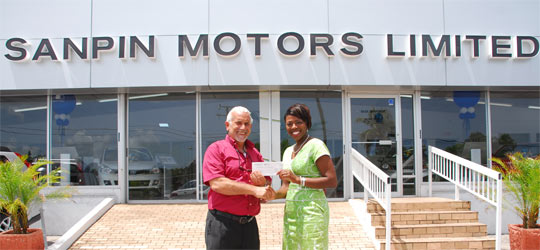 Pictured during the cheque presentation is Sanpin Motors Sales Manager Andrew Johnson and Lynn Terez Davis. (Photo by Torrell Glinton for Harris Media Group)