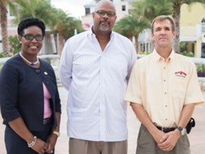 CAPTION: Sandra Smith, Branch Manager, COLINA; Ed Fields VP Communications, Atlantis; Mark Roberts Owner FYP Builders Mall representing 3 of the major sponsors of this years Red Ribbon Ball on Novembr 16th.