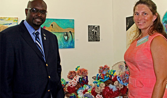 3. Kenred Dorsett, Minister of the Environment & Housing and BREEF’s Executive Director, Casuarina McKinney-Lambert, admire climate-change inspired art at exhibition opening. (photo by Dominic Cant)