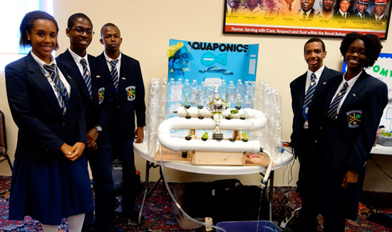 Bishop Michael Eldon High School team members Philyssse Forbes, Malik Dickenson, Sydney Seymour, Dangle Martin and Nathan Cooper from Bishop Michael Eldon High School won the overall first place title with an Aquaponics exhibit.